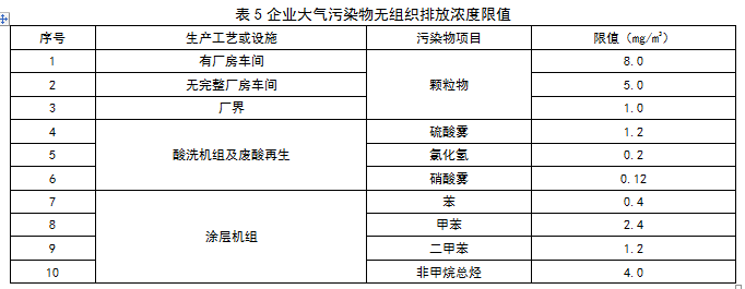企業邊界大氣污染物任何1小時平均濃度執行表5規定的限值。