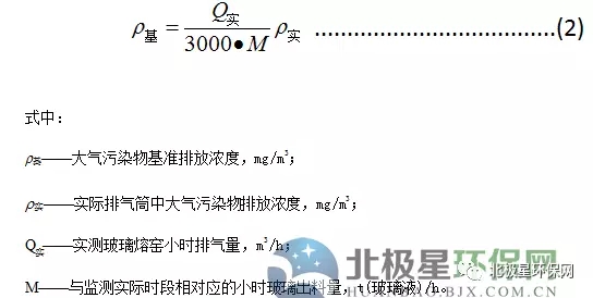 1.5 純氧燃燒玻璃熔窯應監測排氣筒中大氣污染物排氣濃度、排氣量及相應時間的玻璃出料量,按式(2)計算基準排放量[3000m3/t(玻璃液)]條件下的基準排放濃度。并以此作為判定排放是否達標的依據。大氣污染物排放濃度、排氣量、產品產量的監測、統計周期為1h,可連續采樣或等時間間隔采樣獲得大氣污染物排放濃度和排放氣量數據,玻璃出料量數據以企業統計報表為依據。