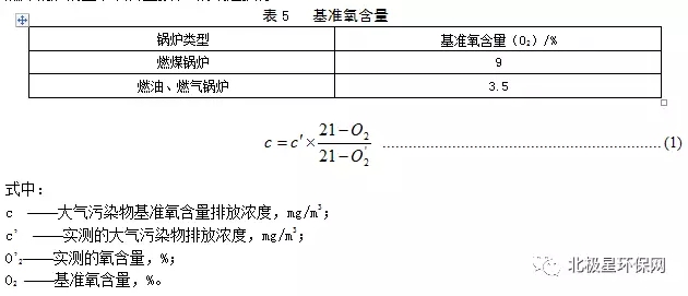 實測的鍋爐顆粒物、二氧化硫和氮氧化物排放濃度,必須按公式(1)折算為基準氧含量排放濃度。燃煤鍋爐的基準氧含量按表5的規定執行。